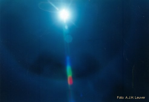 In Den Helder was onlangs (16 mei 2001) een zeldzaam natuurverschijnsel te zien. In eerste instantie hierop geattendeerd door de buurvrouw, die naar boven keek om te zien wanneer de wolk voor de zon zou verdwijnen, konden wij dit natuurverschijnsel zelf aanschouwen. Een telefoontje naar het zuiden van het land leerde ons dat het ging om een plaatselijk verschijnsel, want daar was er niets van te zien. Hier volgt een beschrijving: Te zien was een grote grijze cirkelvlak, met aan de buitenrand een kleurenrand die leek op een regenboog, maar minder helder van kleur was. De zon werd door dit geheel ietwat versluierd. Je zou het kunnen vergelijken met een lichtbol die schuilgaat achter een plafonnière. Alleen een stuk indrukwekkender! Ik heb dit verschijnsel al vaker aanschouwd en de aanwezigen bij het medicijnwiel in Vierhouten tijdens het eigentijdsfestival een aantal jaren geleden, zullen het zich waarschijnlijk ook nog wel kunnen herinneren. Er is echter één verschil: dit keer was de cirkel wel helemaal gesloten. Ik heb het verschijnsel de afgelopen 5jaar steeds vaker gezien, vooral in Zandvoort aan de zee als de zon op ong. 15-20 graden stond. Over het algemeen was de circel dan te zien in bijna altijd aanwezige sluierbewolking. Voor die tijd was het werkelijk een zeldzaam verschijjnsel, waaraan door veel mensen een bijzondere betekenis wordt gehecht. Men kan zich afvragen of er iets in onze aardatmosfeer is veranderd en of dat ten goede of ten kwade is. Zoals er tegenwoordig een steeds breder wordende band violet in de regenbogen verschijnt. Ook daarbij rijst de vraag of het door milieuvervuiling komt, of zoals een aantal onder ons beweren, doordat het spirituele niveau stijgt?! Dit natuurverschijnsel herkende ik in ieder geval als een parhelium. Het woordenboek geeft hier vrwijwel geen uitleg bij, alleen het woord 'bijzon of bijmaan'. Typisch is ook dat ik bij het gebruik van de zoekdienst, zelfs die op verschillende, astronomische sites, nul op rekest kreeg. Zelfs met een groothoeklens was de cirkel er niet in zijn geheel op te krijgen, maar in ieder geval heeft mijn vader heeft kans gezien om een deel van het verschijnsel op de gevoelige plaat vast te leggen. De kleuren waren met het blote oog niet, maar door de lens tijdens het maken van de foto wél zichtbaar.