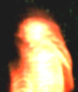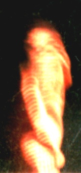 The original Polaroid photo contained scratches, which appear as diagonal lines in this image. Note, however, the orange-tan object, above and just to the right of the creature. There is also an orange object at the extreme right. High resolution scans of these objects were inconclusive. What they suggest, however, is the presence of a second creature to the right, and perhaps, a structure of some sort in the background, behind the dense foliage. * *************** * ************** * The alleged alien appears to have been photographed outside at night. The photograph shows the alien's right arm and side. He is standing still or almost still. If he were walking, his arms would have been swinging like a primate, rather than hang in a resting position at his sides. Note the orangish glow around the alien's head, neck, shoulders, and backside of his body. The glow is likely the alien's energy field. It is possible the glow was not apparent to the photographer. Note the absence of an energy glow on his front side. Note muscular structure in torso, arms, thighs, and hand. It is easy to presume the orange striping is part of the skin, but it may not be. Due to the cloudiness surrounding the striping, it could also be part of the alien's energy field. It is also easy to presume this is the skin of a reptilian, but there is no indication of such. Note plasma light halfway between alien and right edge of photo. Note brownish streak above alien's head which is very likely an extinguishing plasma light. Plasma lights occur naturally but are often invisible to the human eye. However, a camera will often detect and record these energies. Alien are often seen in proximity with plasma-type lights. Note mystery light on far right side of photo. Is this a plasma light? UFO light? Posterior of another alien walking? If you have information about this alien, please contact us at abductions@aol.com