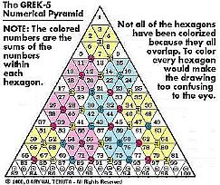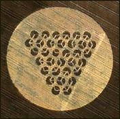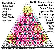 You've just entered a realm somewhere outside the bounds of conventional wisdom... a world of words and ideas... a place where reality can shift at any given tnemom. See what I mean? Welcome to... The CodeZone. This week's installment asks the question: Are Crop Circles Part Of Our Encrypted Reality? Last week we introduced the Grek-5 Numerical Pyramid, or G5NP for short. That diagram, you'll recall, was initially sent to me in a very simple form sometime in the late 1980s or early 1990s by my friend, Tom, one of the two people involved with me in the strange phenomenon which presented itself as communication with intelligent beings from a planet they called Grek-5. Over some period of months I was able to draw out the remarkable complexity of numerical and geometric patterns which it displays in its present form. Then it sat gathering dust in my files, year after year. Periodically I would show it to people who had an interest in such things. I hoped someone, somewhere along the way, might have a clue as to how it could relate to other diagrams in sacred geometry. Perhaps someone had seen something similar to it before. Something. Anything. But no one could offer any information. Not even Brad Steiger, with all of his depth and breadth of knowledge and experience in such matters, could recognize it as relating to anything he'd seen before. So it remained simply a curiosity for the next several years. Then something extraordinary happened. In August of 1999 a crop circle* (see photo) appeared near Avebury, England which appears to have an intriguing correlation to the GREK-5 NUMERICAL PYRAMID (see illustration). The crop formation, you can see, consists of 33 small circles. Each small circle contains small broken lines. The broken lines produce the illusion of cubes in 3-D. Briefly, what you are looking at in the drawing shown here is the Grek-5 Numerical Pyramid with the elements of the Avebury Crop Circle superimposed on top of it as an overlay. Since the photo of the crop circle was taken at an angle, I simply rotated it clockwise until the point was at the top. Then, in a graphics program, I traced the circles of the crop formation and the short broken lines. Notice how the short broken lines correspond directly with the hexagons on the G5NP. This results is some interesting numerical correlations involving the key gematrian numbers 3, 6, and 9 (In a future article we see how these three numbers have also been discovered to have a special function within the Fibonacci number sequence).